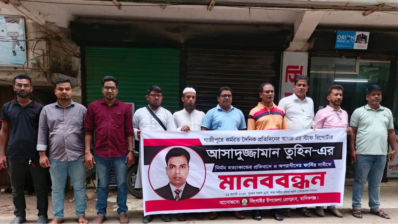 সাংবাদিক তুহিন হত্যার প্রতিবাদে সিংগাইর উপজেলা প্রেসক্লাবের মানববন্ধন