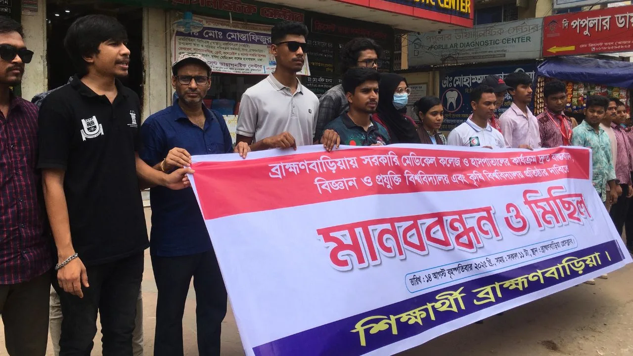 ব্রাহ্মণবাড়িয়ায় মেডিকেল কলেজ হাসপাতাল প্রতিষ্ঠার ঘোষণা বাস্তবায়নের কার্যক্রম দ্রুত শুরু এবং বিজ্ঞান ও প্রযুক্তি বিশ্ববিদ্যালয় ও কৃষি বিশ্ববিদ্যালয় প্রতিষ্ঠার দাবিতে মানববন্ধন ও বিক্ষোভ মিছিল অনুষ্ঠিত হয়েছে।