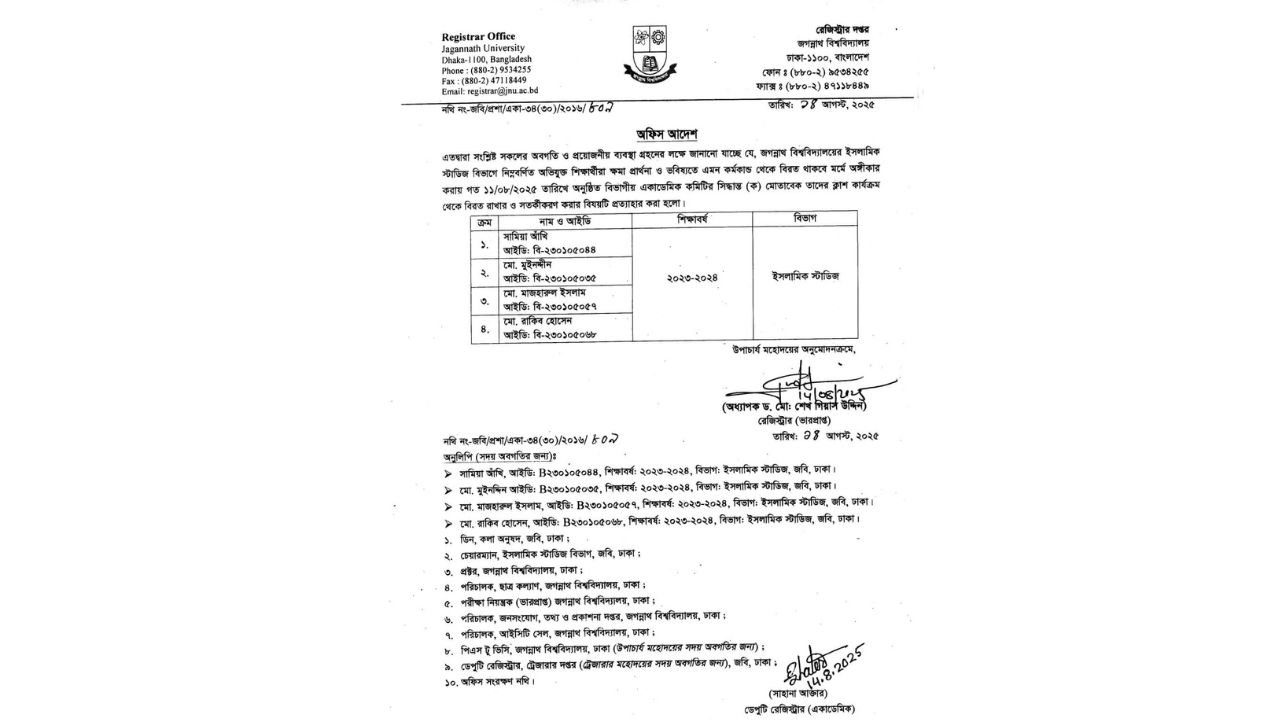 জগন্নাথ বিশ্ববিদ্যালয়ের (জবি) ইসলামিক স্টাডিজ বিভাগে র্যাগিং-য়ের অভিযোগে দেওয়া বহিষ্কার ও ক্লাস কার্যক্রমে নিষেধাজ্ঞা প্রত্যাহার করেছে বিশ্ববিদ্যালয় প্রশাসন। বৃহস্পতিবার (১৪ আগস্ট) ভারপ্রাপ্ত রেজিস্ট্রার অধ্যাপক ড. মো. শেখ গিয়াস উদ্দিন স্বাক্ষরিত পৃথক দুটি বিজ্ঞপ্তিতে এ সিদ্ধান্তের কথা জানানো হয়।