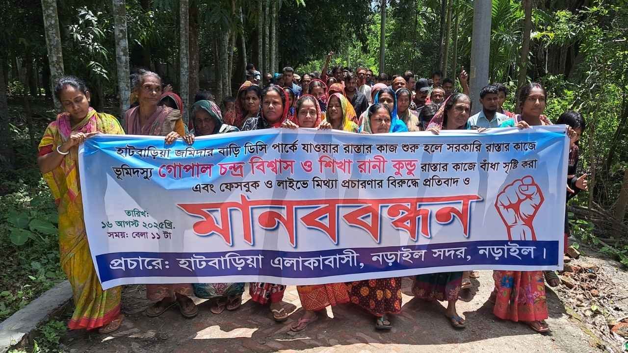 নড়াইলের হাটবাড়িয়ায় ভূমিদস্যুদের বাধা ও মিথ্যা প্রচারণার প্রতিবাদে বিক্ষোভ ও মানববন্ধন