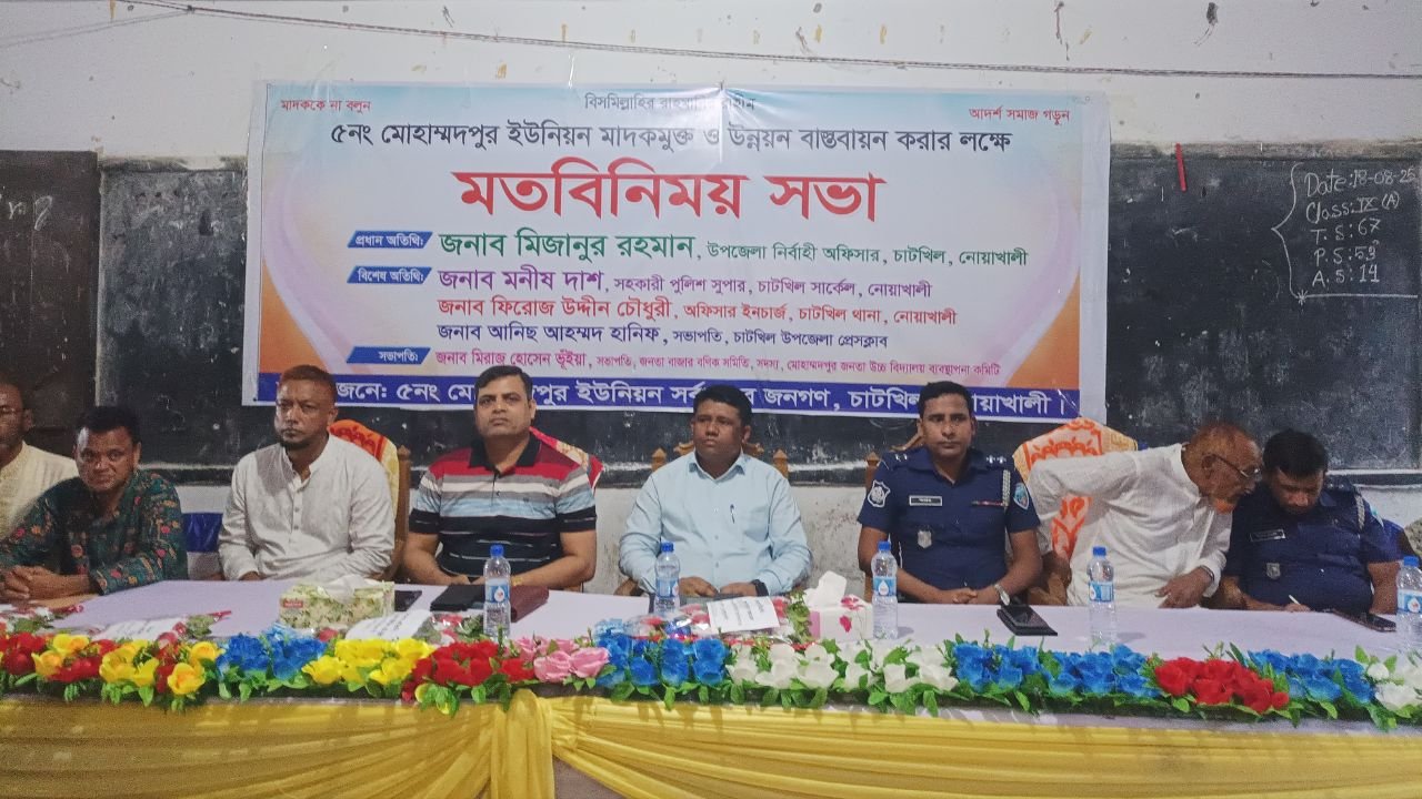 নোয়াখালীর চাটখিল উপজেলার মোহাম্মদপুর ইউনিয়নে মাদকমুক্ত সমাজ গঠন ও উন্নয়ন বাস্তবায়ন করার লক্ষ্যে মতবিনিময় সভা অনুষ্ঠিত হয়েছে।