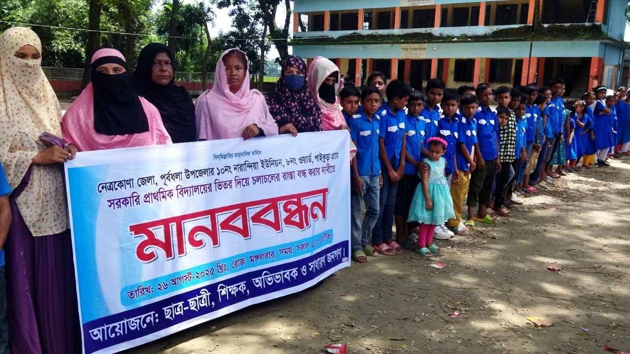 নেত্রকোনা জেলার পূর্বধলা উপজেলার নারান্দিয়া ইউনিয়নের পাইকুড়া সরকারি প্রাথমিক বিদ্যালয়ের ভেতর দিয়ে যানবাহন চলাচল বন্ধের দাবিতে মানববন্ধন কর্মসূচি পালন করেছে শিক্ষার্থী, শিক্ষক, অভিভাবক ও এলাকাবাসী।