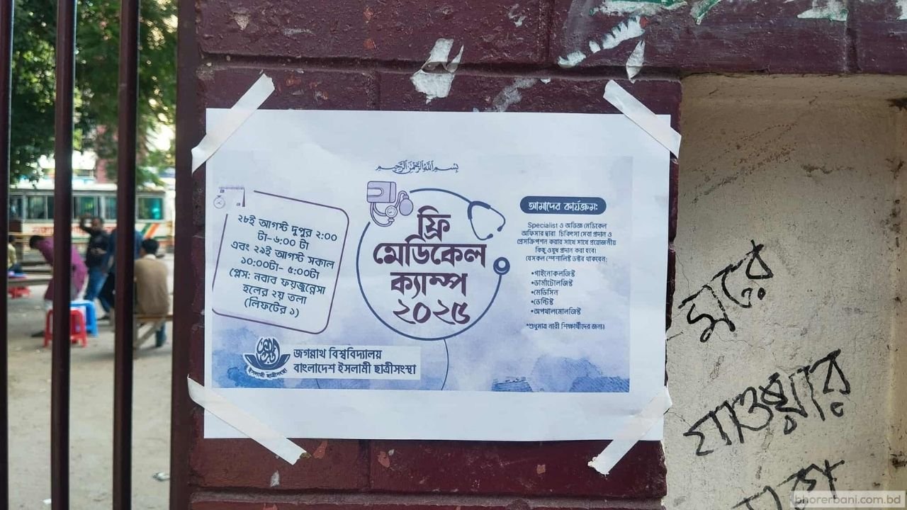 পোস্টারে উল্লেখ করা হয়, বাংলাদেশ ইসলামী ছাত্রসংস্থার উদ্যোগে আয়োজিত “ফ্রি মেডিকেল ক্যাম্প ২০২৫” অনুষ্ঠিত হবে নবাব ফয়জুন্নেছা হলের দ্বিতীয় তলায় (লিফটের পাশে)। ক্যাম্প চলবে আগামী ২৮ আগস্ট দুপুর ২টা থেকে বিকেল ৬টা পর্যন্ত এবং ২৯ আগস্ট সকাল ১০টা থেকে বিকেল ৫টা পর্যন্ত।