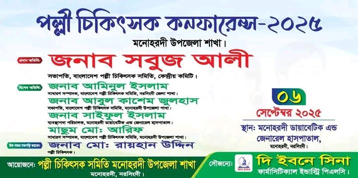 নরসিংদীর মনোহরদীতে আগামী ৬ সেপ্টেম্বর (শনিবার) অনুষ্ঠিত হতে যাচ্ছে বহুল প্রতীক্ষিত ‘পল্লী চিকিৎসক কনফারেন্স-২০২৫’। স্বাস্থ্যসেবার মানোন্নয়ন এবং পল্লী চিকিৎসকদের পেশাগত দক্ষতা বৃদ্ধির লক্ষ্যে এই আয়োজন করা হয়েছে। সম্মেলনটি অনুষ্ঠিত হবে মনোহরদী ডায়াবেটিক এন্ড জেনারেল হাসপাতাল প্রাঙ্গণে। আয়োজন করছে বাংলাদেশ পল্লী চিকিৎসক সমিতি, মনোহরদী উপজেলা শাখা।