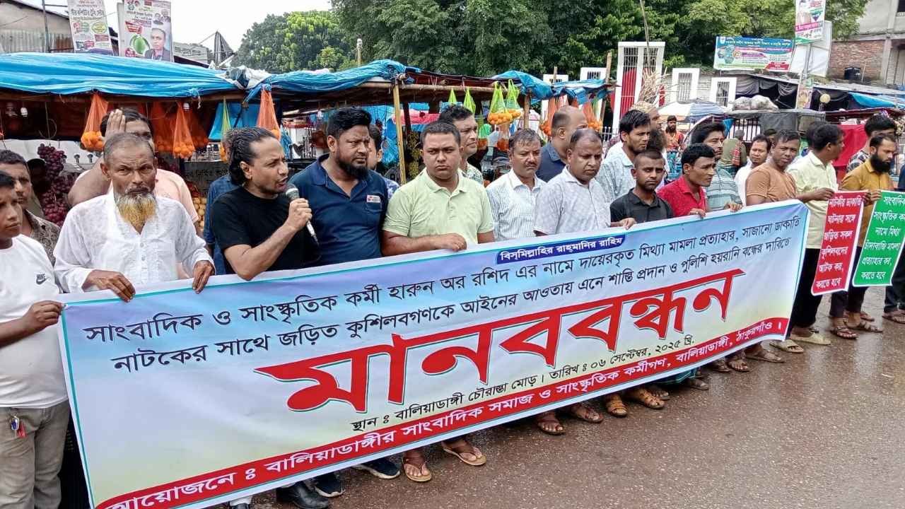বালিয়াডাঙ্গীতে সাংবাদিক হারুনের বিরুদ্ধে মামলা প্রত্যাহারের দাবিতে সড়ক অবরোধ ও মানববন্ধন
