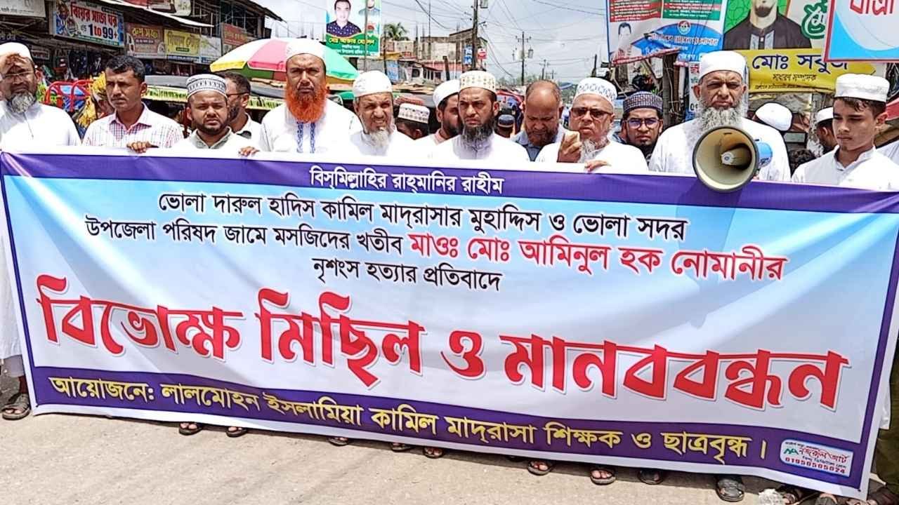 ভোলায় মাদরাসা শিক্ষক হত্যার প্রতিবাদে বিক্ষোভ মিছিল ও মানববন্ধন