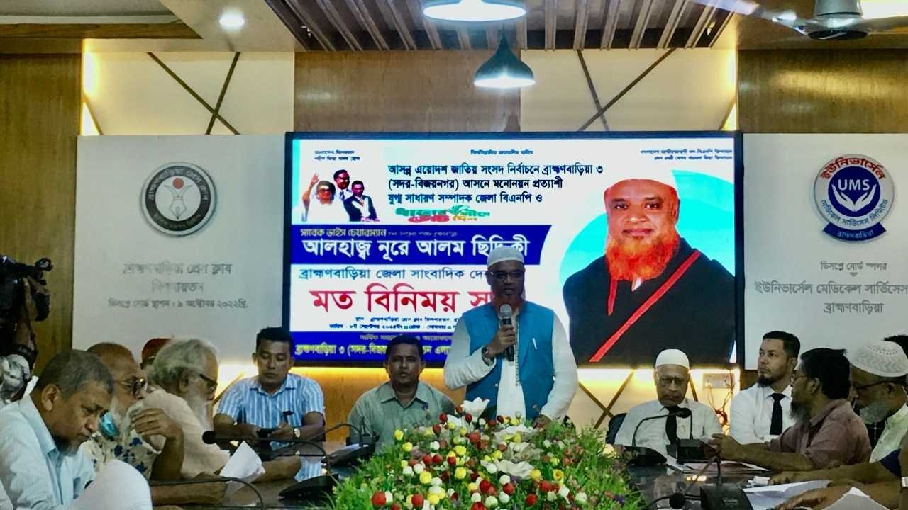 আসন্ন ত্রয়োদশ জাতীয় সংসদ নির্বাচনের প্রস্তুতি নিয়ে ব্রাহ্মণবাড়িয়া-৩ (সদর ও বিজয়নগর) আসনে বিএনপির মনোনয়ন প্রত্যাশী, জেলা বিএনপির যুগ্ম সাধারণ সম্পাদক ও সাবেক সদর উপজেলা ভাইস চেয়ারম্যান নুরে আলম সিদ্দিকী সোমবার (৮ সেপ্টেম্বর) ব্রাহ্মণবাড়িয়া প্রেসক্লাব মিলনায়তনে সাংবাদিকদের সঙ্গে মতবিনিময় ও সংবাদ সম্মেলন করেন।