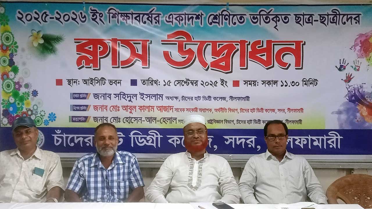 নীলফামারী সদরের চাঁদের হাট ডিগ্রি কলেজে ২০২৫-২৬ শিক্ষাবর্ষে একাদশ শ্রেণিতে ভর্তি হওয়া শিক্ষার্থীদের নিয়ে ক্লাস উদ্বোধনী অনুষ্ঠান অনুষ্ঠিত হয়েছে। সোমবার (১৫ সেপ্টেম্বর) সকাল ১১টা ৩০ মিনিটে কলেজের আইসিটি ভবনে এ আয়োজন হয়।