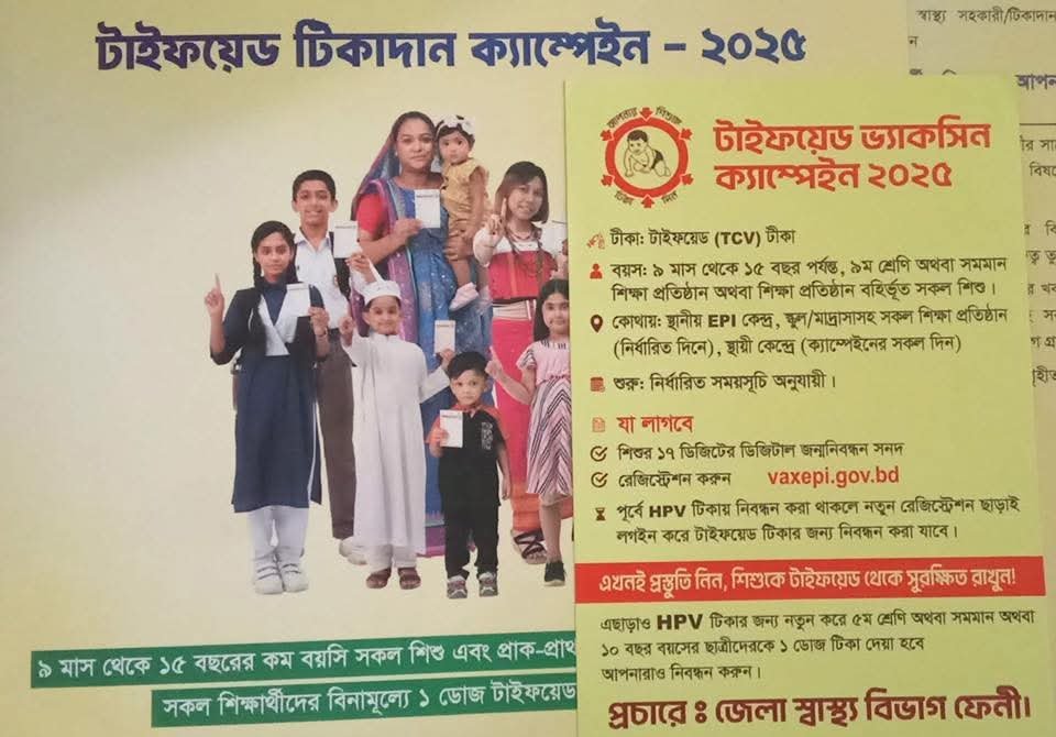 ফেনীতে আগামী ১২ অক্টোবর থেকে শুরু হচ্ছে এক মাসব্যাপী টাইফয়েড টিকাদান ক্যাম্পেইন, যা চলবে ১৩ নভেম্বর পর্যন্ত। জেলার ৯ মাস থেকে ১৫ বছর বয়সী (শিক্ষাপ্রতিষ্ঠানে নবম শ্রেণি পর্যন্ত) প্রায় ৪ লাখ ২৫ হাজার শিশুকে টাইফয়েড কনজুগেট ভ্যাকসিন (TCV) দেওয়া হবে।