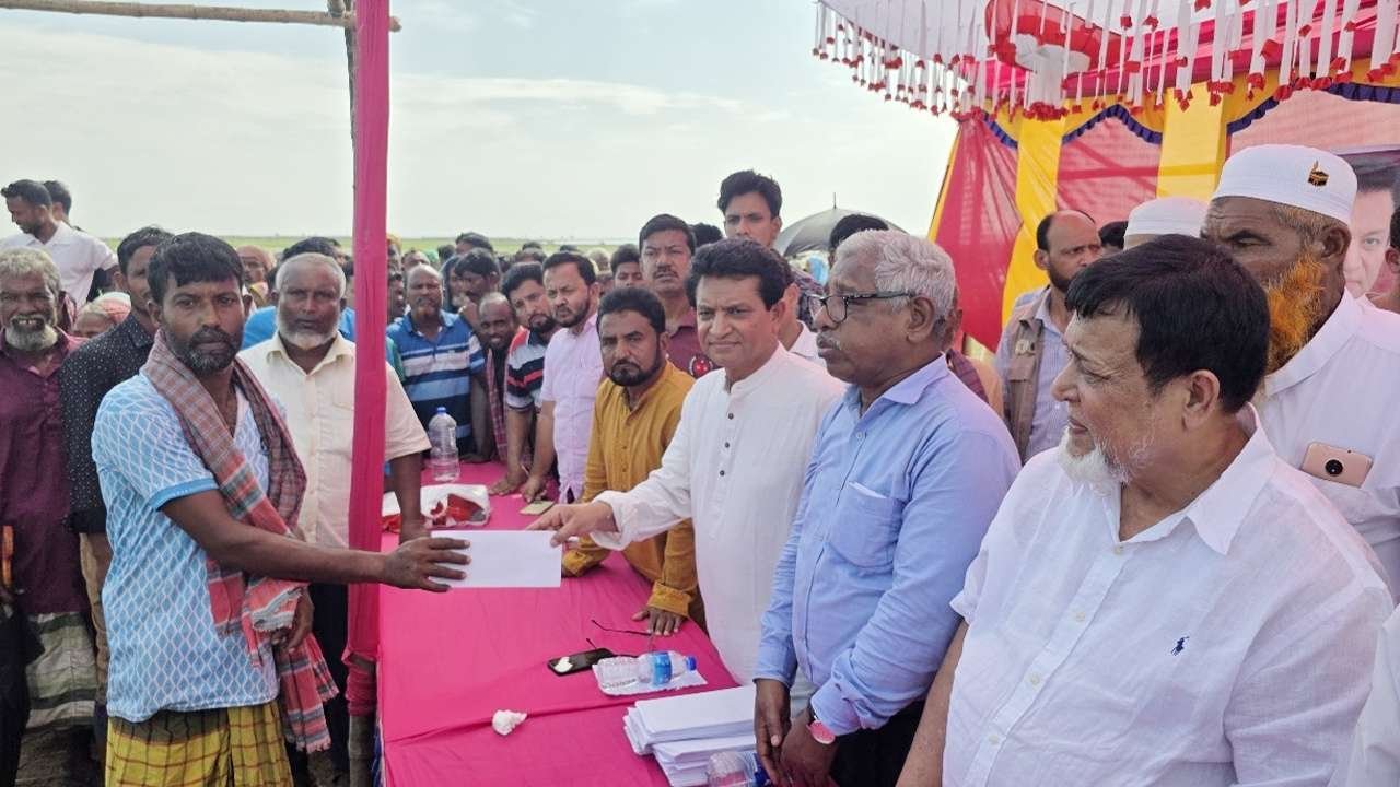 ভাঙা প্যান্ডেলের নিচে দাঁড়িয়েই অনুদান বিতরণ করলেন এ কে আজাদ