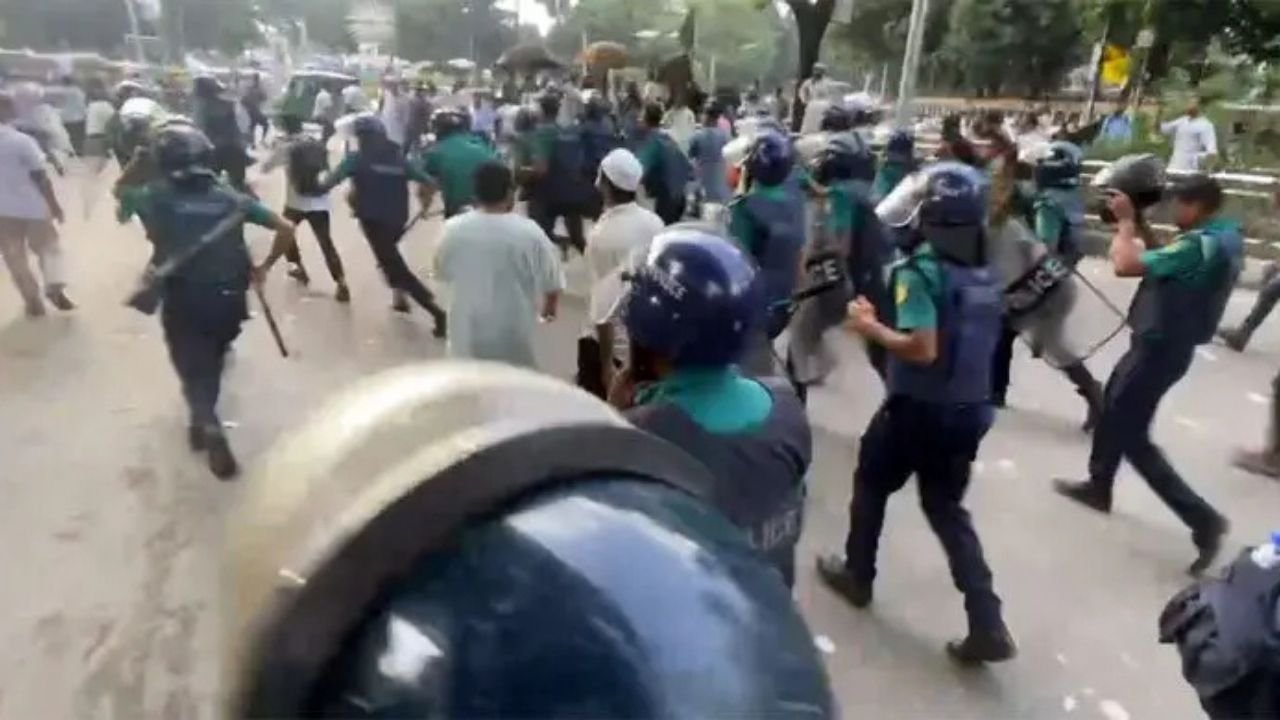 জাতীয় প্রেসক্লাবের সামনে মূল বেতনের ২০ শতাংশ বাড়িভাড়া ও চিকিৎসা ভাতা বৃদ্ধিসহ সর্বজনীন এমপিওভুক্ত শিক্ষা জাতীয়করণ বাস্তবায়নের দাবিতে অবস্থান কর্মসূচি পালনরত শিক্ষকদের সরাতে পুলিশ সাউন্ড গ্রেনেড (শব্দ বোমা) নিক্ষেপ করেছে।