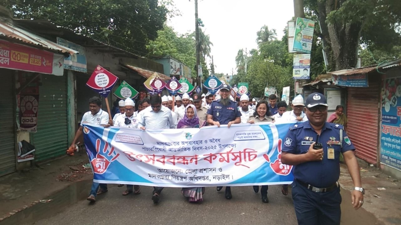 “মাদকাসক্তি মুক্ত বাংলাদেশ গড়াই আমাদের লক্ষ্য”—এই শক্তিশালী স্লোগানকে সামনে রেখে নড়াইলে যথাযোগ্য মর্যাদায় পালিত হয়েছে মাদকদ্রব্যের অপব্যবহার ও অবৈধ পাচার বিরোধী আন্তর্জাতিক দিবস ২০২৫।