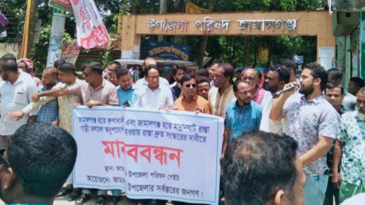 বেহাল সড়ক সংস্কারে জামালগঞ্জে মানববন্ধন, আন্দোলনের হুমকি