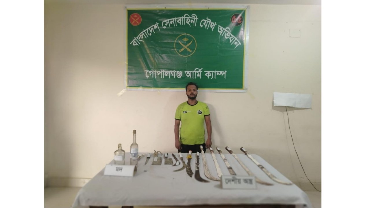 বুধবার (৩ জুলাই ২০২৫) ভোরে গোপন তথ্যের ভিত্তিতে কাশিয়ানী বাজার বাস টার্মিনাল এলাকায় এ অভিযান চালানো হয়। অভিযানে অভিযুক্তের বাড়ি থেকে ৮টি চাপাতি, ১টি লম্বা ছুরি, কাস্তে, বড় ছুরি, কুড়াল, কাঁচি, মোবাইল ফোন ও ২ বোতল বিদেশি মদ উদ্ধার করা হয়।