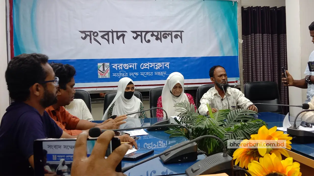 বরগুনা সদর উপজেলার পূর্ব ধুপতি গ্রামে জমি দখল, বসতবাড়ি ভাঙচুর, লুটপাট ও সন্ত্রাসী হামলার অভিযোগে সংবাদ সম্মেলন করেছেন এক ভুক্তভোগী পরিবার।