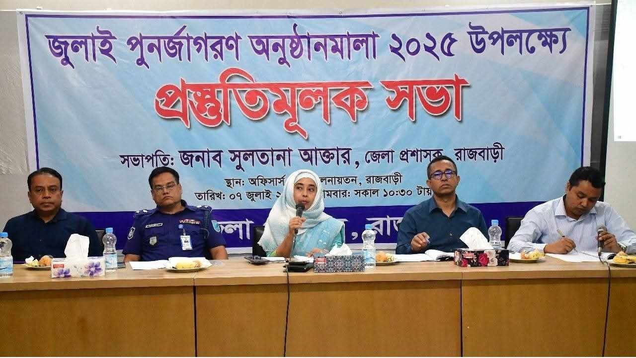 আসন্ন ‘জুলাই পুনর্জাগরণ অনুষ্ঠানমালা ২০২৫’-কে কেন্দ্র করে রাজবাড়ীতে শুরু হয়েছে প্রস্তুতি। সোমবার (৭ জুলাই) সকাল ১০টায় জেলা প্রশাসকের সম্মেলন কক্ষে আয়োজন করা হয় প্রস্তুতিমূলক সভা। সভায় সভাপতিত্ব করেন রাজবাড়ীর জেলা প্রশাসক ও বিজ্ঞ জেলা ম্যাজিস্ট্রেট সুলতানা আক্তার।
