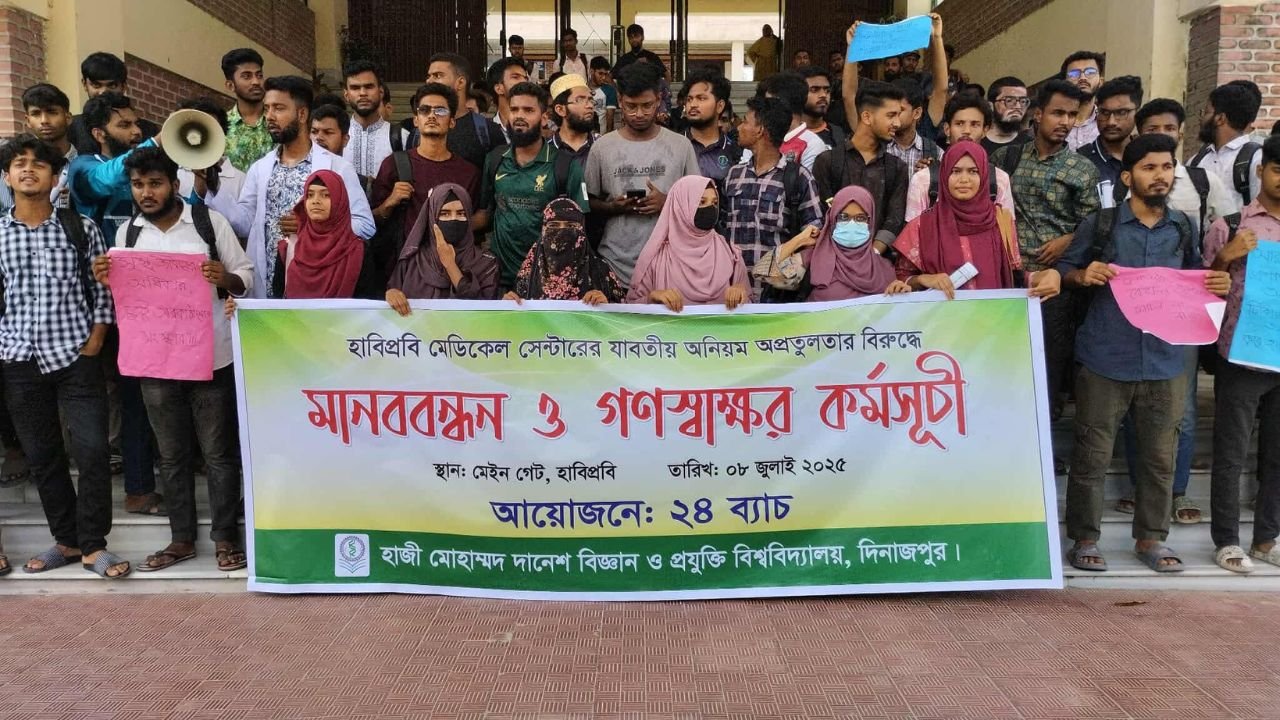 হাজী মোহাম্মদ দানেশ বিজ্ঞান ও প্রযুক্তি বিশ্ববিদ্যালয়ের (হাবিপ্রবি) মেডিকেল সেন্টারের সংস্কারের এবং অনিয়মের বিরুদ্ধে গণস্বাক্ষর কর্মসূচি এবং মানববন্ধন করেছে ২৪ ব্যাচের শিক্ষার্থীরা।