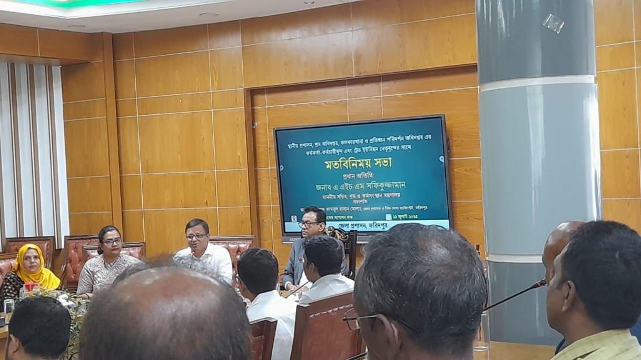শ্রম ও কর্মসংস্থান মন্ত্রণালয়ের সচিব এএইচএম সফিকুজ্জামান এর সাথে ফরিদপুর স্থানীয় প্রশাসন, শ্রম অধিদপ্তর, কলকারখানা ও প্রতিষ্ঠান পরিদর্শন অধিদপ্তরের কর্মকর্তা কর্মচারী এবং ট্রেড ইউনিয়নের নেতৃবৃন্দের সাথে মতবিনিময় সভা অনুষ্ঠিত হয়েছে।