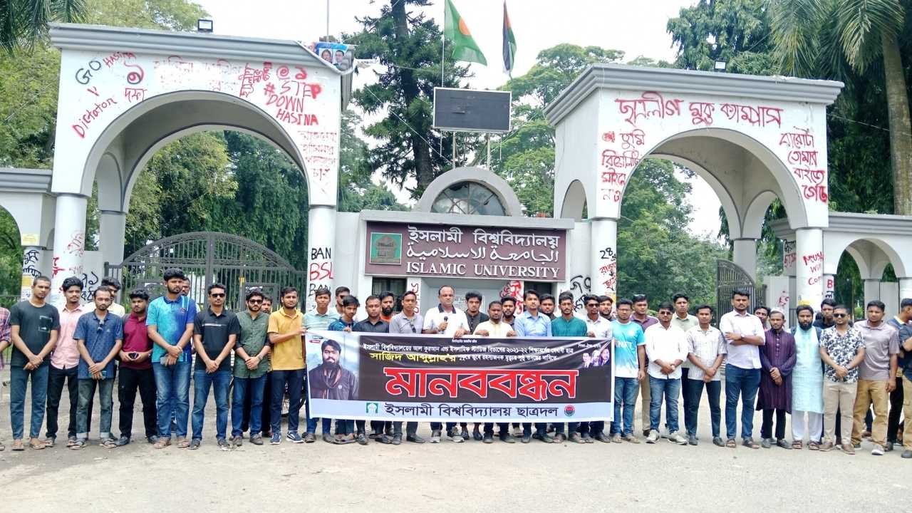 ইসলামী বিশ্ববিদ্যালয়ে (ইবি) শিক্ষার্থীর রহস্যজনক মৃত্যুর সুষ্ঠু তদন্ত ও বিচারের দাবিতে মানববন্ধন করেছে শাখা ছাত্রদল। শনিবার (১৯ জুলাই) বেলা ১১টায় বিশ্ববিদ্যালয়ের প্রধান ফটকের সামনে এ মানববন্ধনটি করেন তারা।