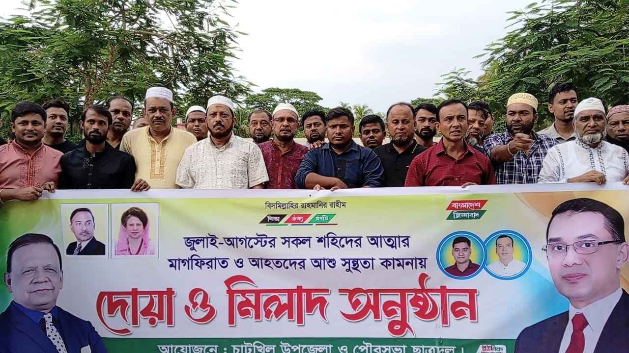 নোয়াখালীর চাটখিলে জুলাই-আগস্টে প্রাণ হারানো শহীদদের স্মরণে দোয়া ও মিলাদ মাহফিল অনুষ্ঠিত হয়েছে। শনিবার বিকেলে চাটখিল কেন্দ্রীয় জামে মসজিদে ব্যারিস্টার মাহবুব উদ্দিন খোকনের নির্দেশনায় উপজেলা ও পৌরসভা জাতীয়তাবাদী ছাত্রদলের উদ্যোগে এ মাহফিলের আয়োজন করা হয়। এতে শহীদদের আত্মত্যাগের প্রতি গভীর শ্রদ্ধা জানিয়ে তাঁদের রুহের মাগফিরাত ও আহতদের দ্রুত আরোগ্য কামনা করা হয়।
