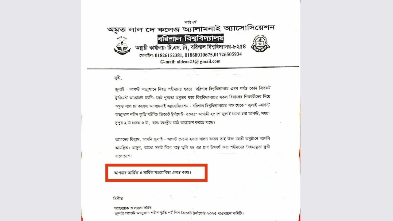 ববিতে জুলাই শহিদদের স্মরনে ক্রিকেট টুর্নামেন্ট আয়োজনের নামে অমৃত লাল দে কলেজ অ্যাসোসিয়েশনের চাঁদাবাজি