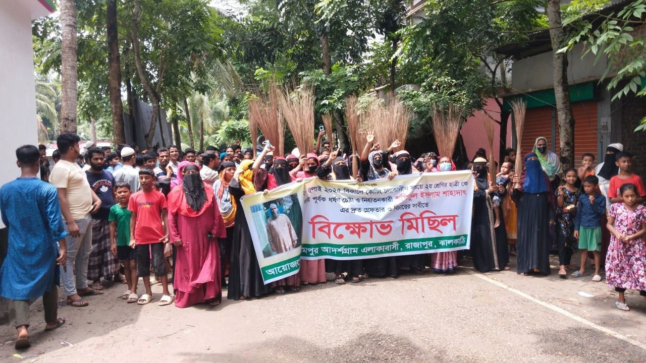 ঝালকাঠিতে শিক্ষক কর্তৃক যৌন নিপীড়নের প্রতিবাদে এলাকাবাসীর ঝাড়ু মিছিল